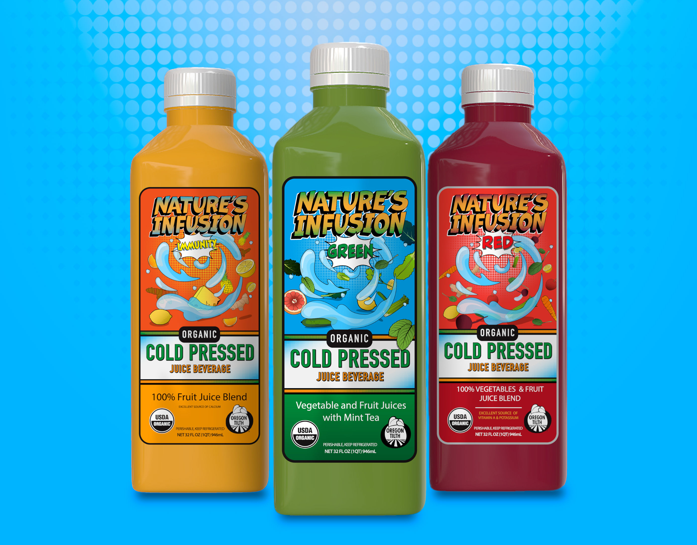 Nature’s Infusion is a fictional rebrand of Trader Joe’s organic cold-pressed juice line, designed to attract a younger, less health-focused audience without losing the product’s natural appeal. The branding uses playful gradients, bold labeling, and approachable design elements to make wellness feel more fun and accessible. This project explores how visual identity can shift perception and expand market reach through thoughtful repositioning.
