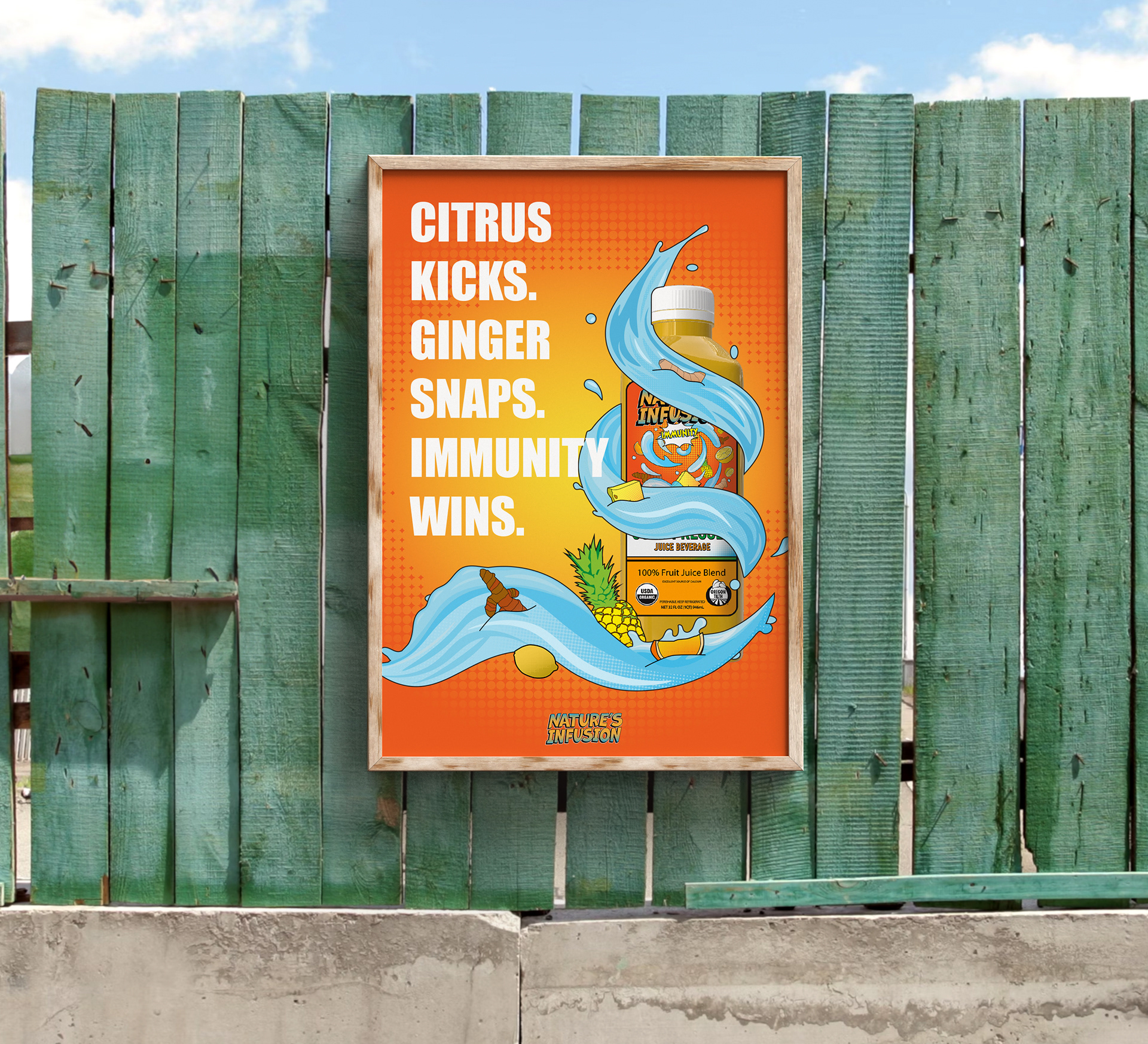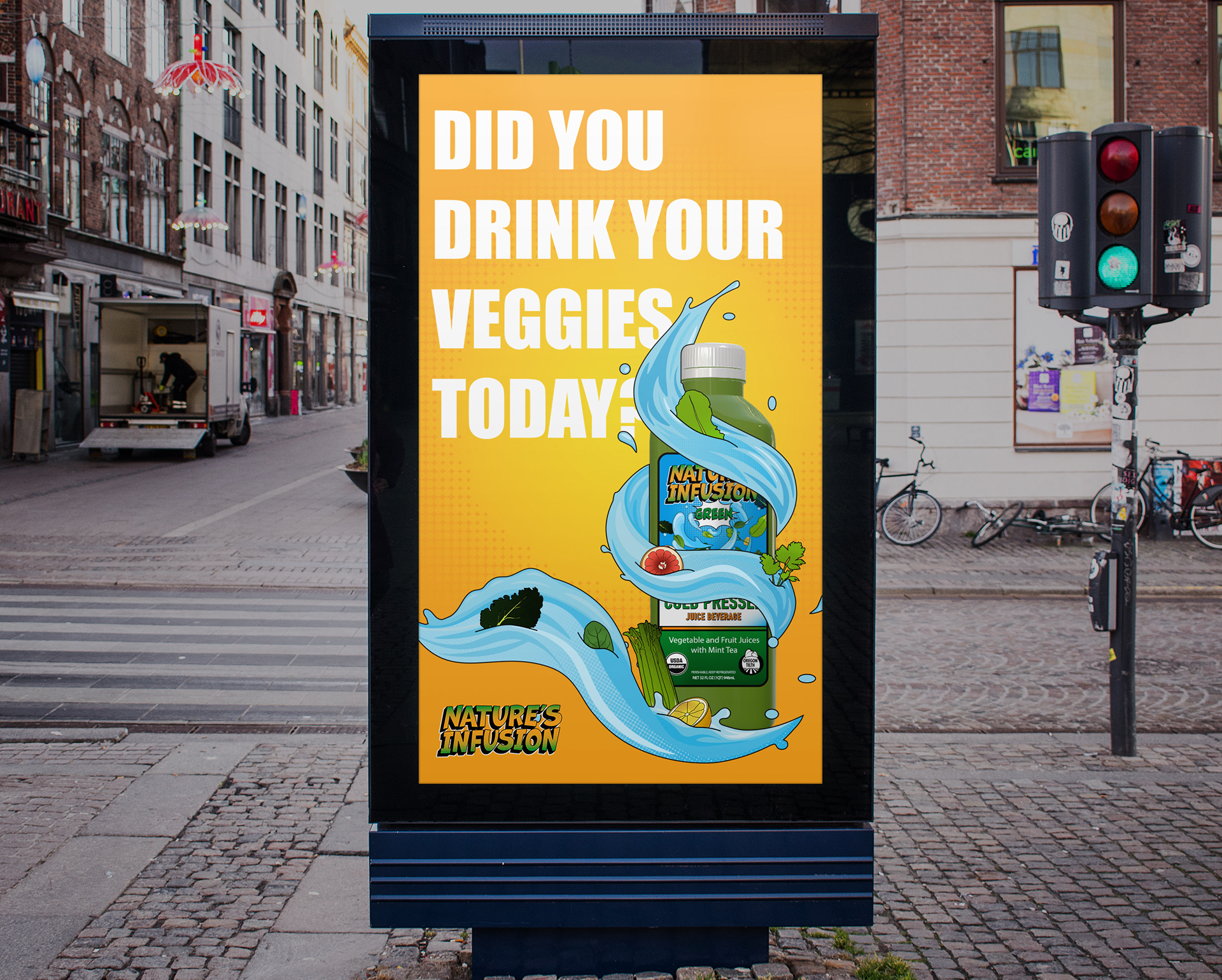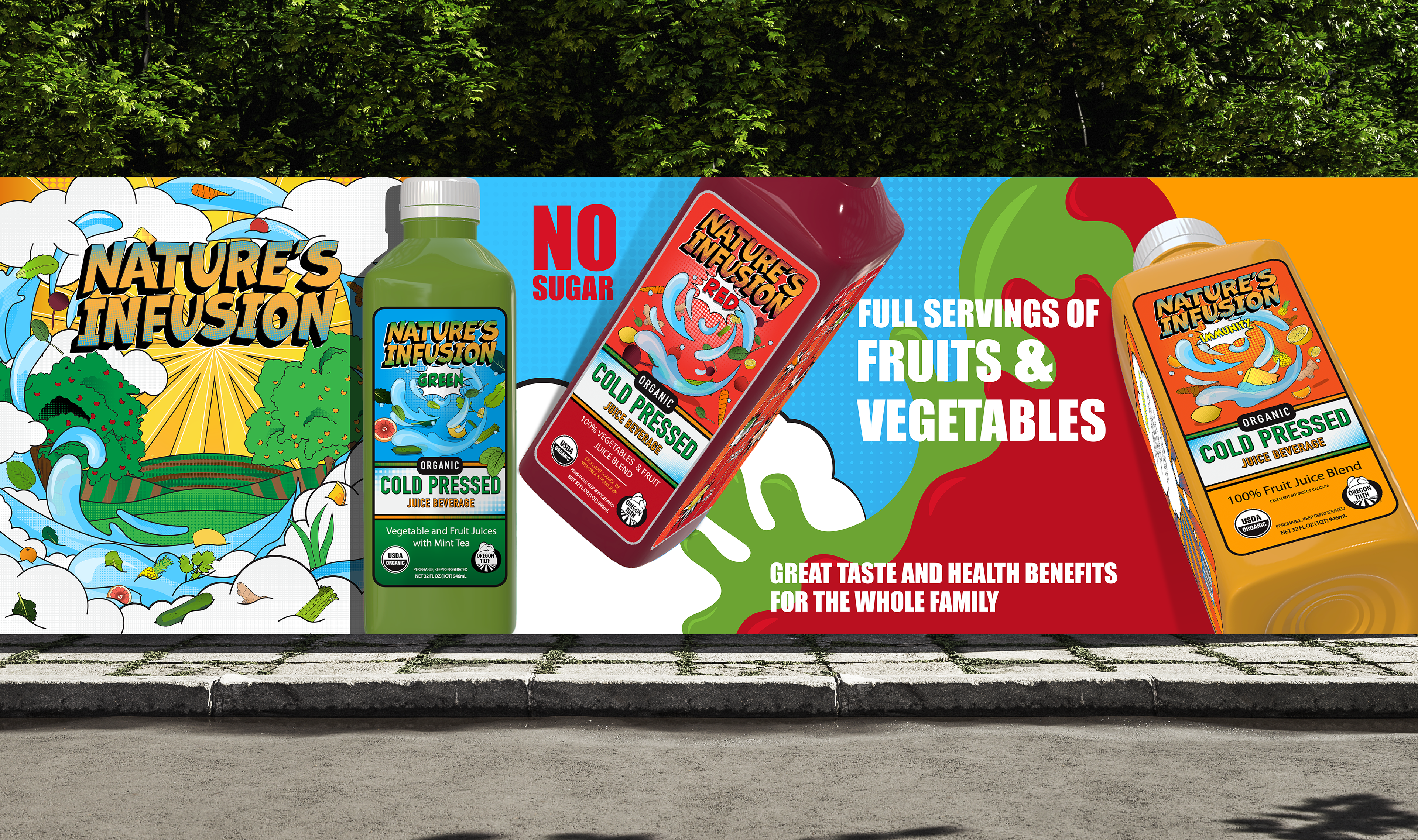 Nature’s Infusion is a conceptual rebrand of an organic cold-pressed juice line by Trader Joe’s. The goal was to modernize the brand for a younger audience by combining nutritional clarity with expressive, art-forward design. I developed a full brand identity system, including logo, typography, color palette, and label design for multiple juice flavors. The branding was extended across packaging, social media content, and a print campaign that communicated the functional benefits of each juice through accessible, benefit-driven messaging. This project focuses on blending wellness with creativity to make healthy habits more inviting and repeatable.