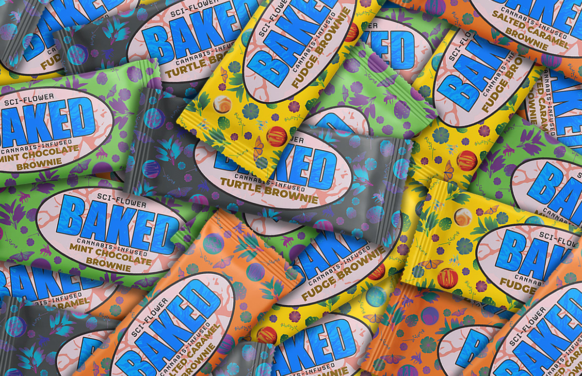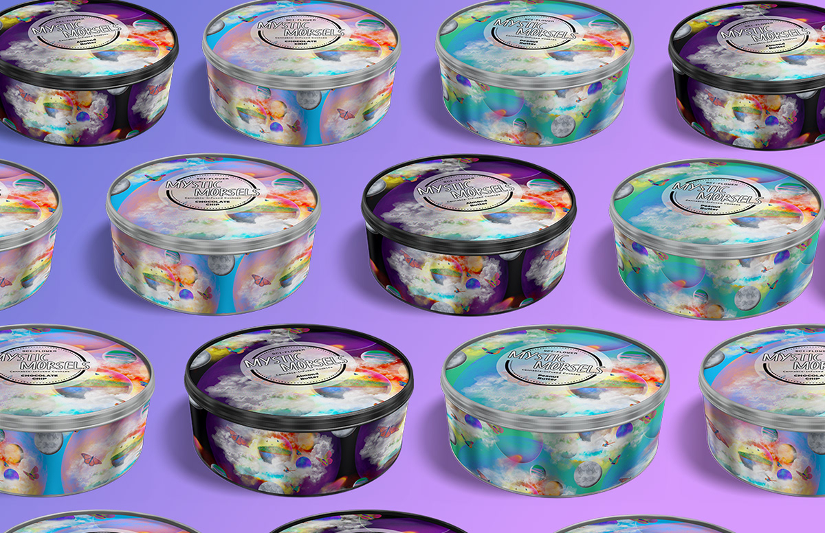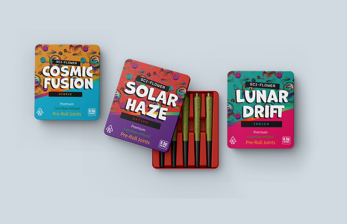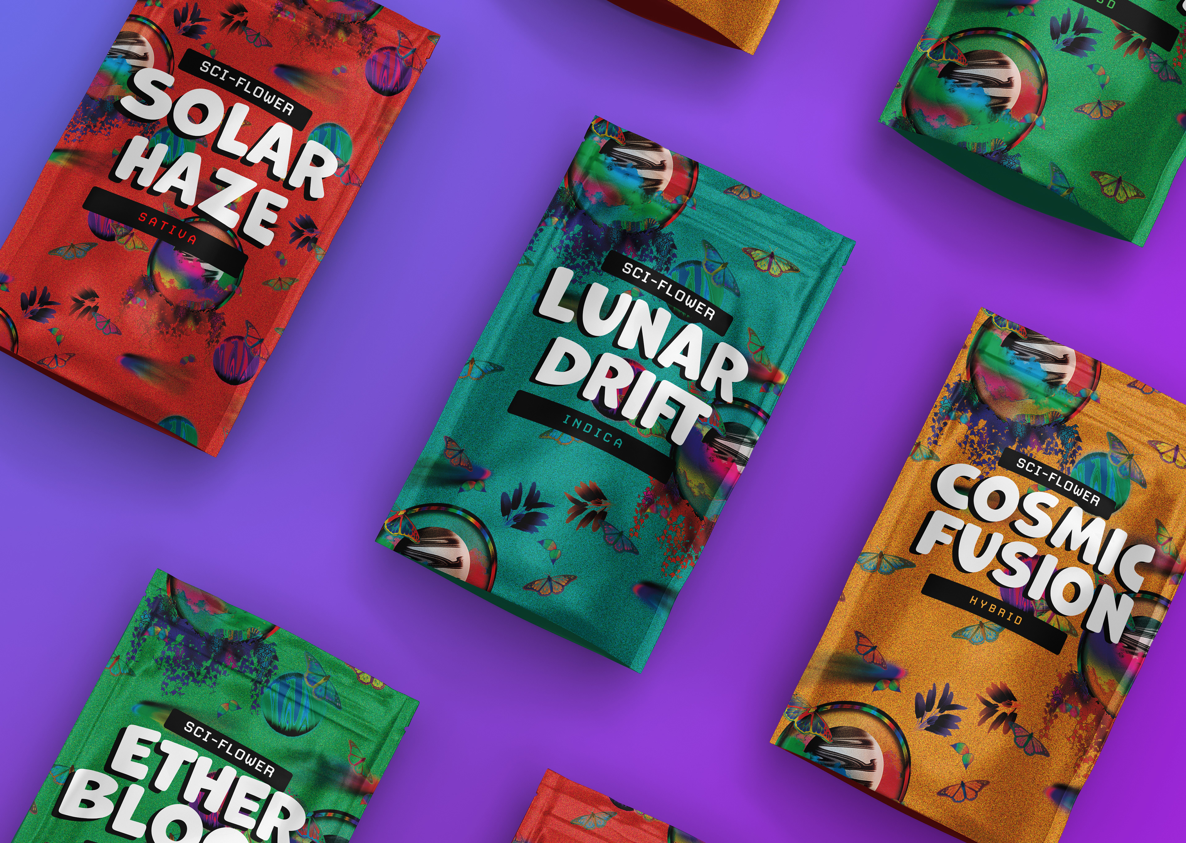 SCI-Flower is a visual brand concept developed for a surface design class, centered on creating a unique aesthetic system for cannabis-based wellness products. The project explores how expressive design can transform everyday items, like rolling trays, packaging, and accessories nto intentional, art-forward brand experiences.